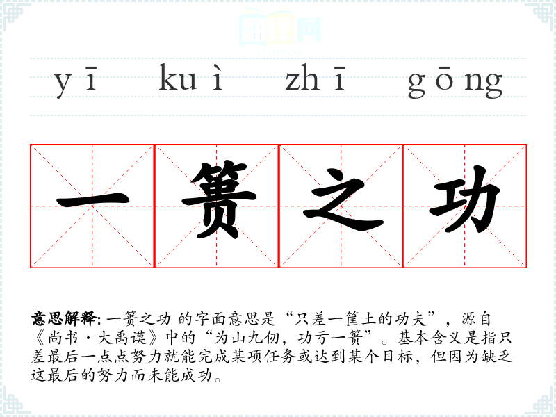 一篑之功 的字面意思是“只差一筐土的功夫”,源自《尚书·大禹谟》中的“为山九仞,功亏一篑”。基本含义是指只差最后一点点努力就能完成某项任务或达到某个目标,但因为缺乏这最后的努力而未能成功。