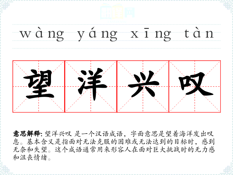 望洋兴叹 是一个汉语成语,字面意思是望着海洋发出叹息。基本含义是指面对无法克服的困难或无法达到的目标时,感到无奈和失望。这个成语通常用来形容人在面对巨大挑战时的无力感和沮丧情绪。