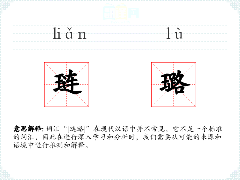 - 反义词:无(由于“琏璐”不是一个常用词汇,很难找到直接的反义词)