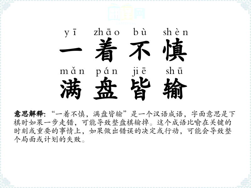 “一着不慎,满盘皆输”是一个汉语成语,字面意思是下棋时如果一步走错,可能导致整盘棋输掉。这个成语比喻在关键的时刻或重要的事情上,如果做出错误的决定或行动,可能会导致整个局面或计划的失败。