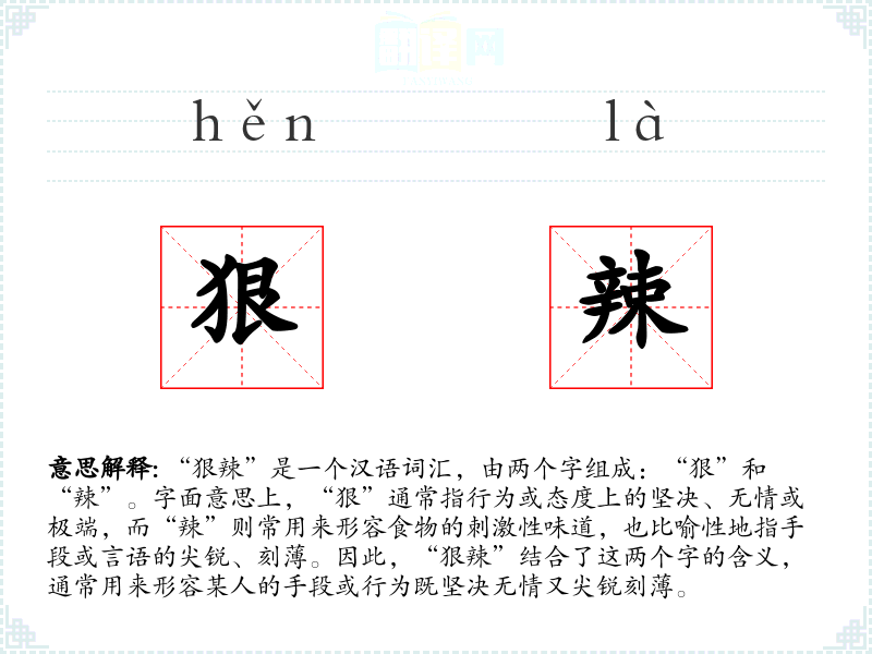 “狠”字在古代汉语中已有使用,最初指狗的凶猛,后引申为人或行为的坚决和无情。“辣”字则源于对食物刺激性味道的描述,后扩展到比喻性的用法。两个字的结合,“狠辣”,则是在现代汉语中形成的复合词,用以形容更加极端和尖锐的行为或手段。