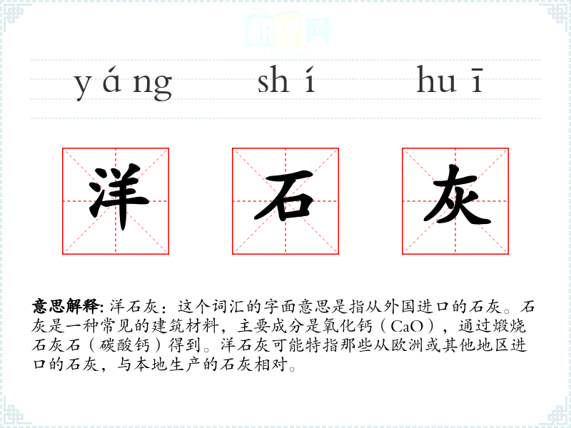 洋石灰:这个词汇的字面意思是指从外国进口的石灰。石灰是一种常见的建筑材料,主要成分是氧化钙(CaO),通过煅烧石灰石(碳酸钙)得到。洋石灰可能特指那些从欧洲或其他地区进口的石灰,与本地生产的石灰相对。