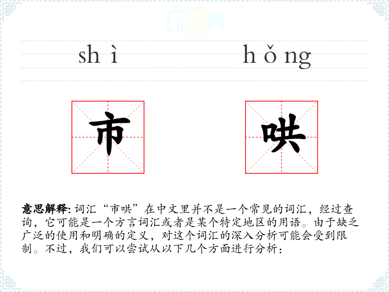 由于“市哄”不是一个标准的中文词汇,我们无法给出一个确切的字面意思和基本含义。它可能是指在市场上的一种喧闹或混乱的状态,或者是某种特定的市场行为。