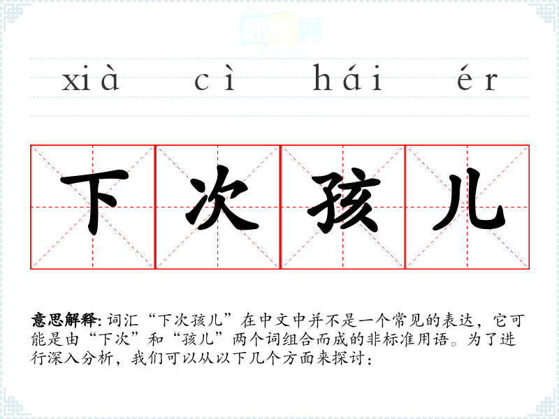 - 字面意思:“下次”通常指的是未来的某个时间点,而“孩儿”是对孩子的俗称。结合起来,“下次孩儿”可能指的是下次某个孩子参与或涉及的情况。