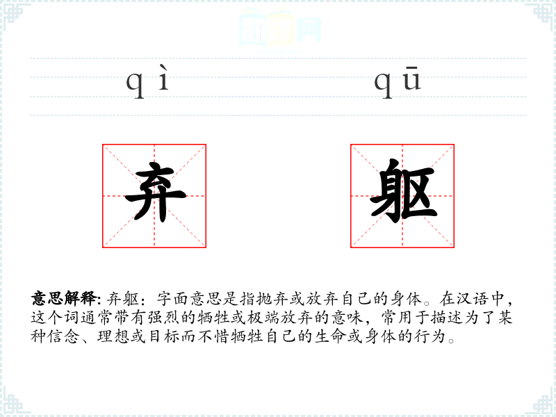 “弃躯”这个词在汉语中承载了深厚的文化和情感意义,它不仅描述了一种极端的牺牲行为,也反映了人们对忠诚、勇气和奉献的价值观。在学*语言和表达时,理解和正确使用这样的词汇,能够丰富我们的表达能力,并深化我们对文化的理解。