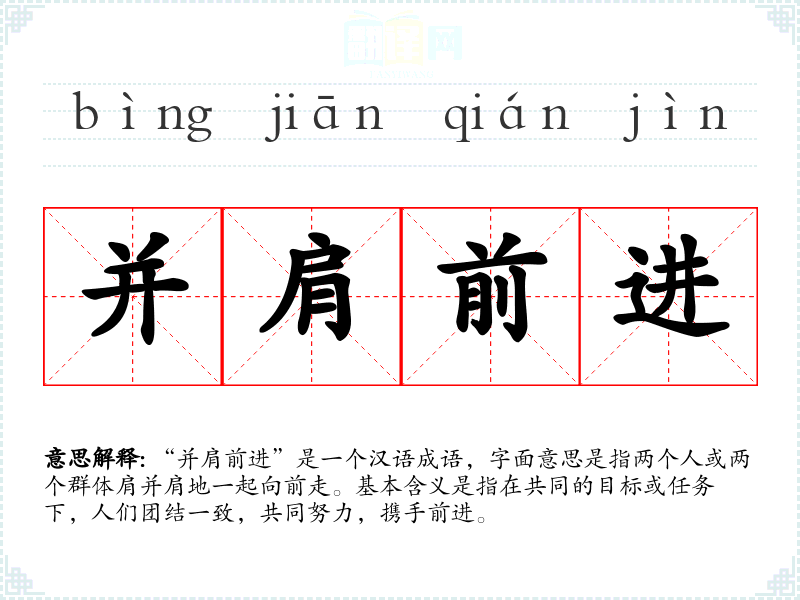 “并肩前进”是一个汉语成语,字面意思是指两个人或两个群体肩并肩地一起向前走。基本含义是指在共同的目标或任务下,人们团结一致,共同努力,携手前进。