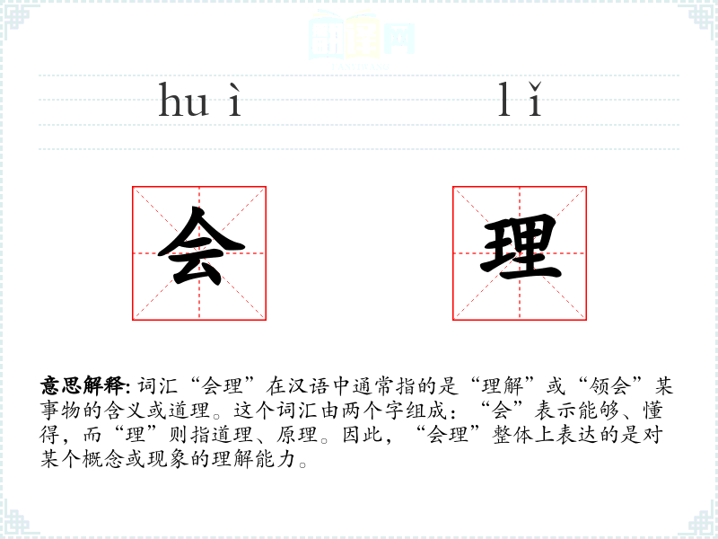 词汇“会理”在汉语中通常指的是“理解”或“领会”某事物的含义或道理。这个词汇由两个字组成:“会”表示能够、懂得,而“理”则指道理、原理。因此,“会理”整体上表达的是对某个概念或现象的理解能力。