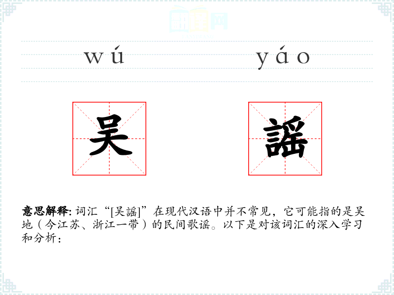 词汇“[吴謡]”在现代汉语中并不常见,它可能指的是吴地(今江苏、浙江一带)的民间歌谣。以下是对该词汇的深入学*和分析: