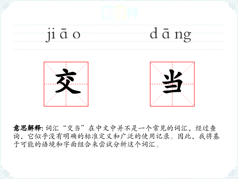 词汇“交当”在中文中并不是一个常见的词汇,经过查询,它似乎没有明确的标准定义和广泛的使用记录。因此,我将基于可能的语境和字面组合来尝试分析这个词汇。