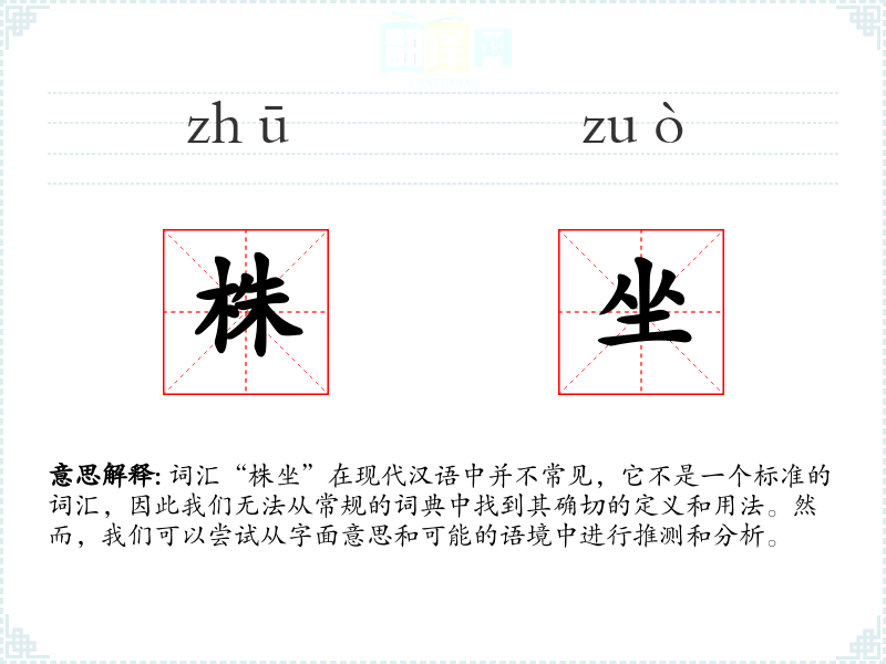 词汇“株坐”在现代汉语中并不常见,它不是一个标准的词汇,因此我们无法从常规的词典中找到其确切的定义和用法。然而,我们可以尝试从字面意思和可能的语境中进行推测和分析。