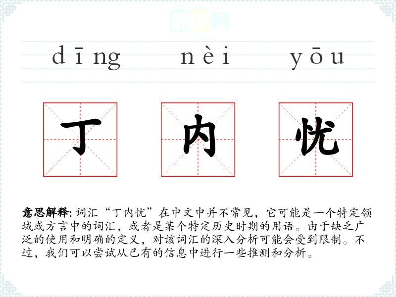 总的来说,“丁内忧”这个词汇可能是一个特定领域或方言中的词汇,或者是某个特定历史时期的用语。由于缺乏广泛的使用和明确的定义,对该词汇的深入分析可能会受到限制。在语言学习和表达中,了解和掌握这样的词汇可能有助于更深入地理解特定文化和社会背景中的语言使用。