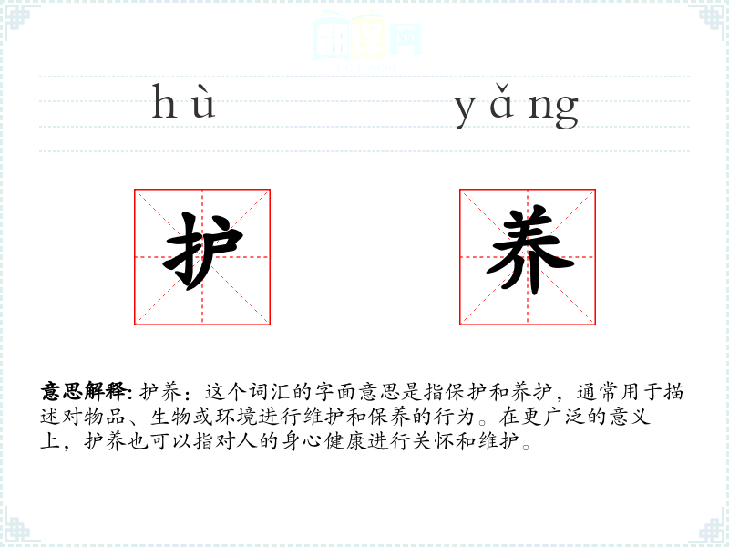 护养:这个词汇的字面意思是指保护和养护,通常用于描述对物品、生物或环境进行维护和保养的行为。在更广泛的意义上,护养也可以指对人的身心健康进行关怀和维护。