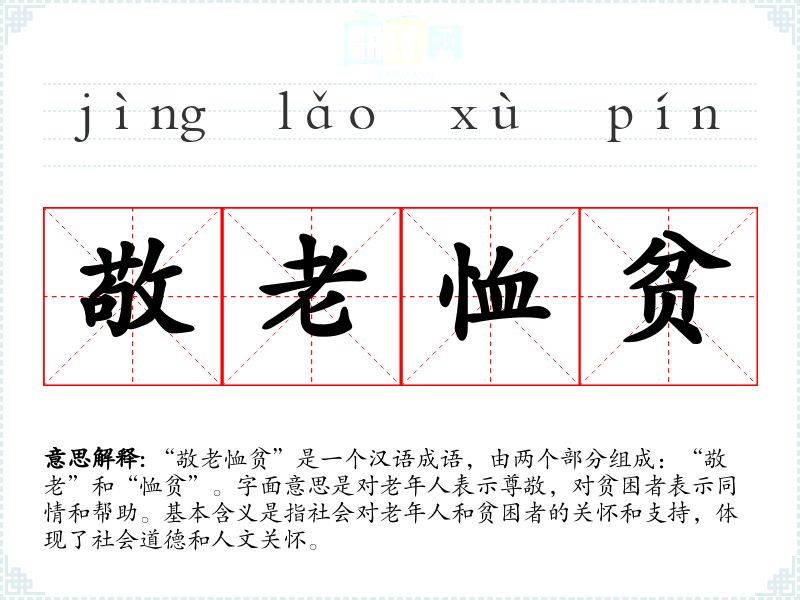 “敬老恤贫”是一个汉语成语,由两个部分组成:“敬老”和“恤贫”。字面意思是对老年人表示尊敬,对贫困者表示同情和帮助。基本含义是指社会对老年人和贫困者的关怀和支持,体现了社会道德和人文关怀。