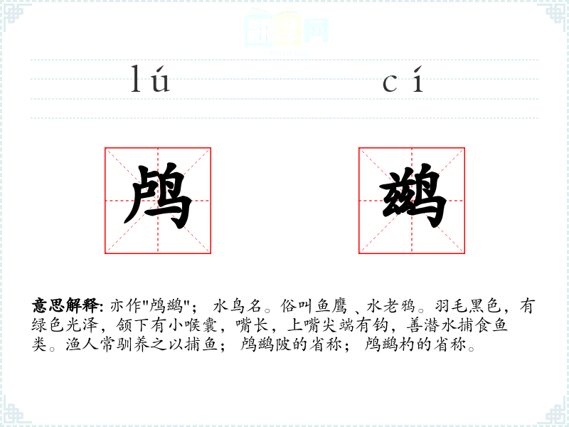 亦作"鸬鹚"; 水鸟名。俗叫鱼鹰﹑水老鸦。羽毛黑色,有绿色光泽,颔下有小喉囊,嘴长,上嘴尖端有钩,善潜水捕食鱼类。渔人常驯养之以捕鱼; 鸬鹚陂的省称; 鸬鹚杓的省称。