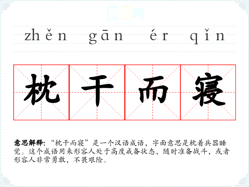“枕干而寝”是一个汉语成语,字面意思是枕着兵器睡觉。这个成语用来形容人处于高度戒备状态,随时准备战斗,或者形容人非常勇敢,不畏艰险。