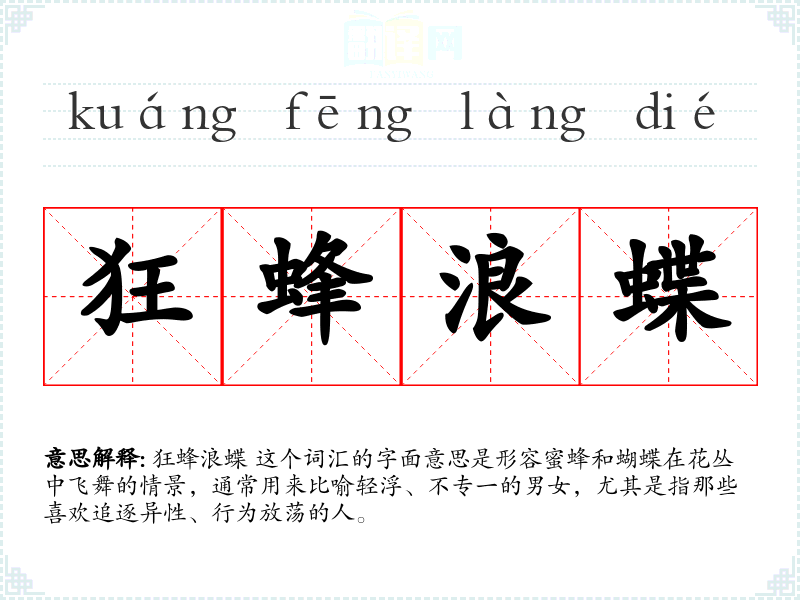 狂蜂浪蝶 这个词汇的字面意思是形容蜜蜂和蝴蝶在花丛中飞舞的情景,通常用来比喻轻浮、不专一的男女,尤其是指那些喜欢追逐异性、行为放荡的人。