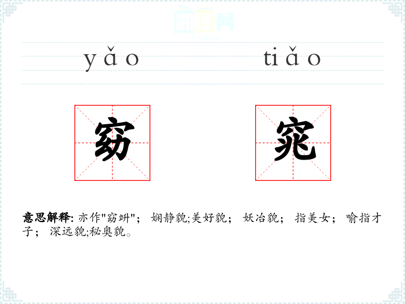 亦作"窈竔"; 娴静貌;美好貌; 妖冶貌; 指美女; 喻指才子; 深远貌;秘奥貌。