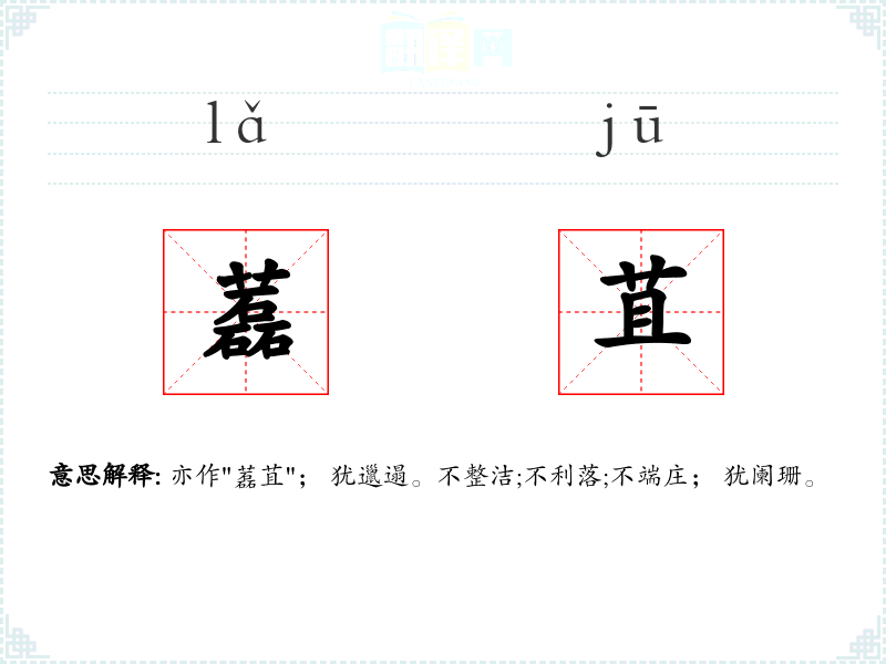 亦作"藞苴"; 犹邋遢。不整洁;不利落;不端庄; 犹阑珊。