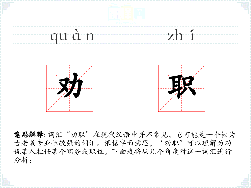 词汇“劝职”在现代汉语中并不常见,它可能是一个较为古老或专业性较强的词汇。根据字面意思,“劝职”可以理解为劝说某人担任某个职务或职位。下面我将从几个角度对这一词汇进行分析: