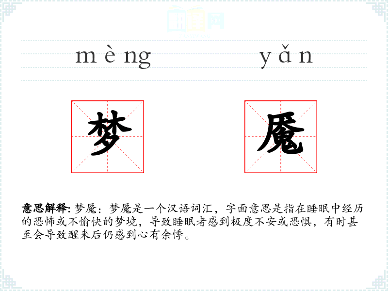 梦魇:梦魇是一个汉语词汇,字面意思是指在睡眠中经历的恐怖或不愉快的梦境,导致睡眠者感到极度不安或恐惧,有时甚至会导致醒来后仍感到心有余悸。