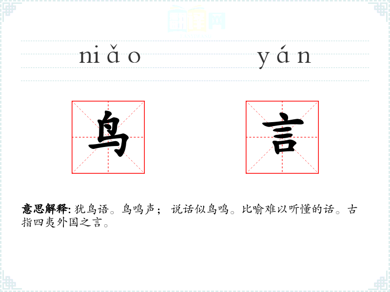 犹鸟语。鸟鸣声; 说话似鸟鸣。比喻难以听懂的话。古指四夷外国之言。