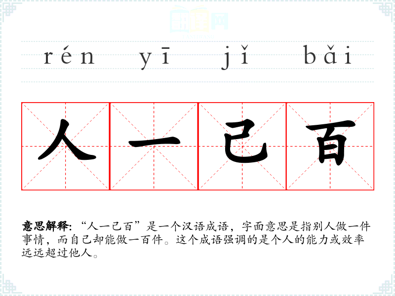 “人一己百”是一个汉语成语,字面意思是指别人做一件事情,而自己却能做一百件。这个成语强调的是个人的能力或效率远远超过他人。