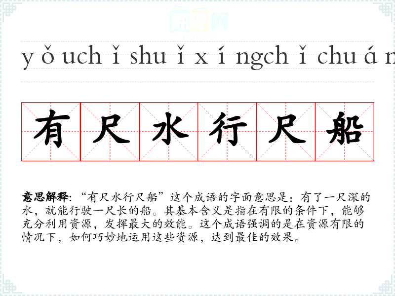 “有尺水行尺船”这个成语的字面意思是:有了一尺深的水,就能行驶一尺长的船。其基本含义是指在有限的条件下,能够充分利用资源,发挥最大的效能。这个成语强调的是在资源有限的情况下,如何巧妙地运用这些资源,达到最佳的效果。