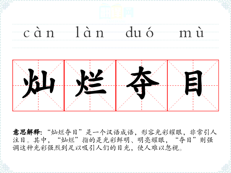 在英语中,类似的表达可能是“dazzling”或“eye-catching”,它们在意义上与“灿烂夺目”相近,但文化内涵和使用场景可能有所不同。