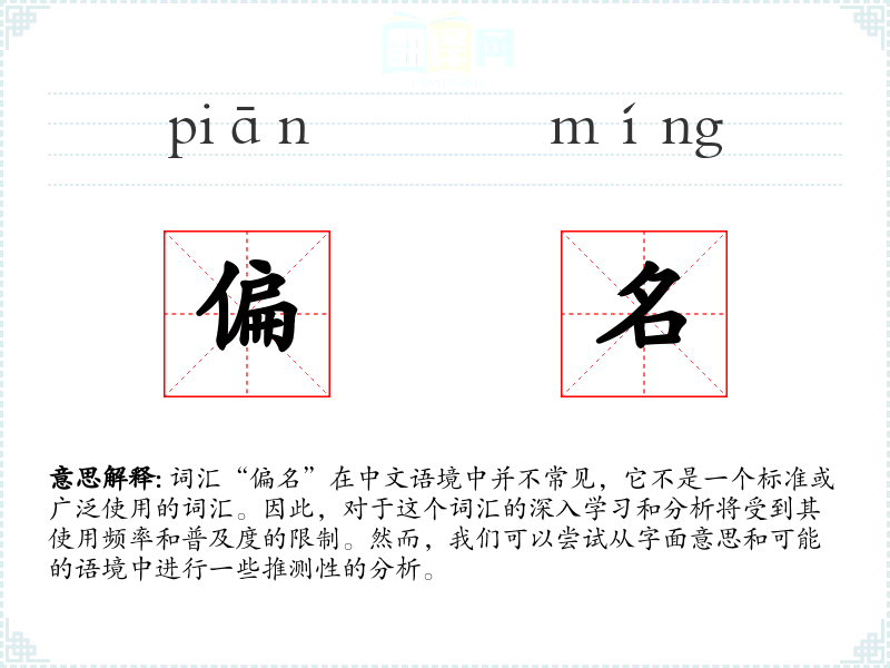 词汇“偏名”在中文语境中并不常见,它不是一个标准或广泛使用的词汇。因此,对于这个词汇的深入学习和分析将受到其使用频率和普及度的限制。然而,我们可以尝试从字面意思和可能的语境中进行一些推测性的分析。