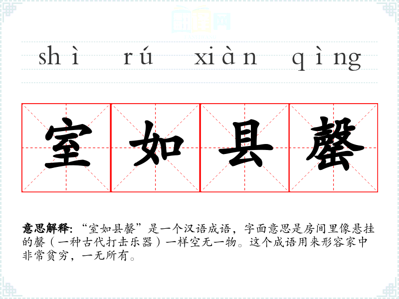 “室如县罄”是一个汉语成语,字面意思是房间里像悬挂的罄(一种古代打击乐器)一样空无一物。这个成语用来形容家中非常贫穷,一无所有。