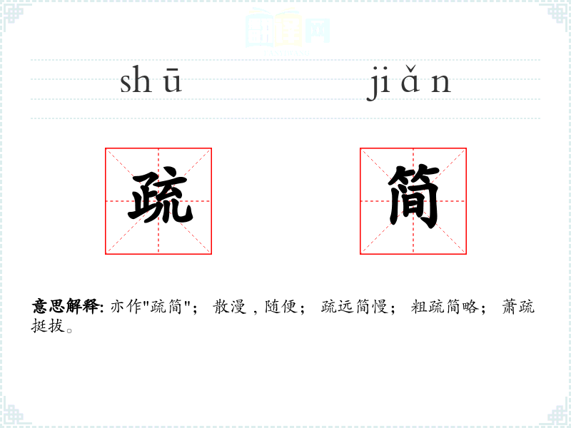亦作"疏简"; 散漫﹐随便; 疏远简慢; 粗疏简略; 萧疏挺拔。