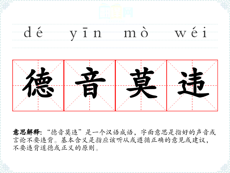 “德音莫违”是一个汉语成语,字面意思是指好的声音或言论不要违背。基本含义是指应该听从或遵循正确的意见或建议,不要违背道德或正义的原则。
