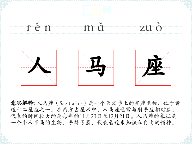 人马座(Sagittarius)是一个天文学上的星座名称,位于黄道十二星座之一。在西方占星术中,人马座通常与射手座相对应,代表的时间段大约是每年的11月23日至12月21日。人马座的象征是一个半人半马的生物,手持弓箭,代表着追求知识和自由的精神。