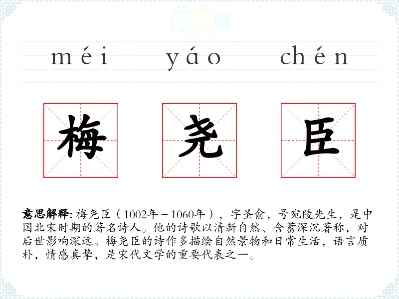 - 反义词:现代诗人(与梅尧臣的时代背景和风格有较大差异)