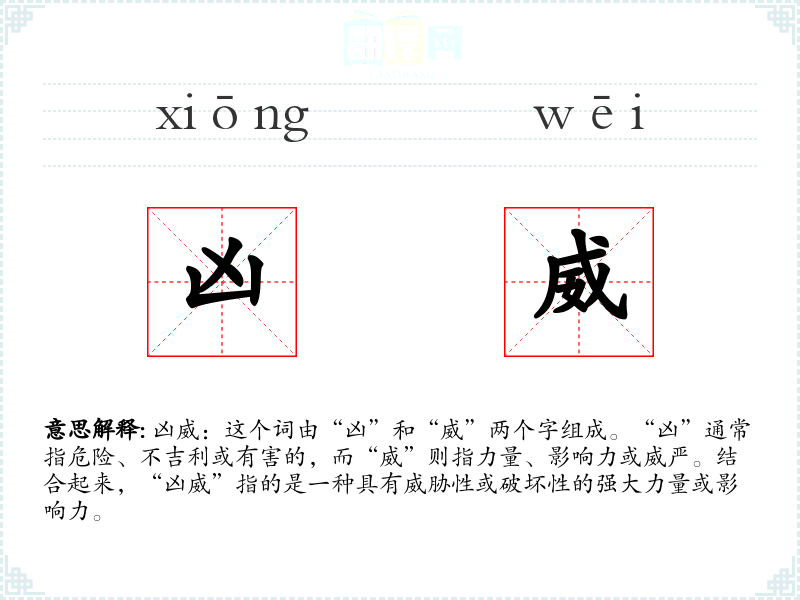 凶威:这个词由“凶”和“威”两个字组成。“凶”通常指危险、不吉利或有害的,而“威”则指力量、影响力或威严。结合起来,“凶威”指的是一种具有威胁性或破坏性的强大力量或影响力。