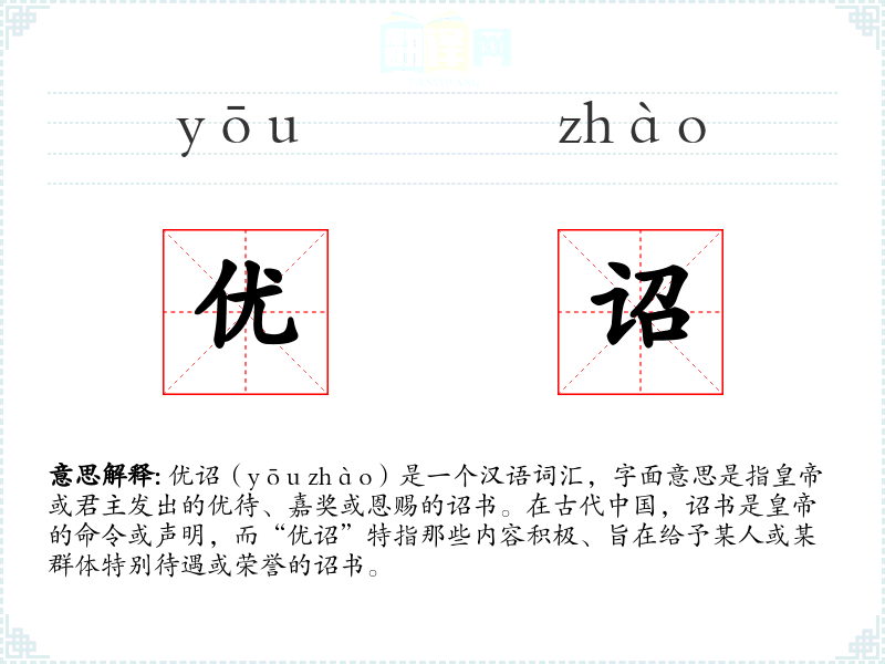 优诏(yōu zhào)是一个汉语词汇,字面意思是指或君主发出的优待、嘉奖或恩赐的诏书。在古代,诏书是**的命令或声明,而“优诏”特指那些内容积极、旨在给予某人或某群体特别待遇或荣誉的诏书。