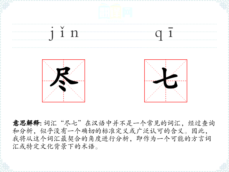 由于“尽七”不是一个标准汉语词汇,我们无法给出一个确切的字面意思和基本含义。它可能是某个地区方言中的词汇,或者是某个特定行业或文化群体中的术语。