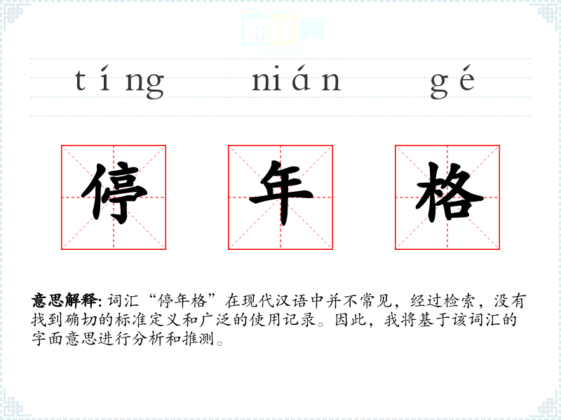 “停年格”字面意思可以拆分为“停”、“年”和“格”三个部分。其中,“停”可能表示停止、停留,“年”指时间单位,“格”可能表示格式、标准或框架。综合来看,“停年格”可能指的是一种与时间相关的停止或停留的标准或框架。