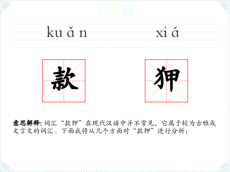 词汇“款狎”在现代汉语中并不常见,它属于较为古雅或文言文的词汇。下面我将从几个方面对“款狎”进行分析: