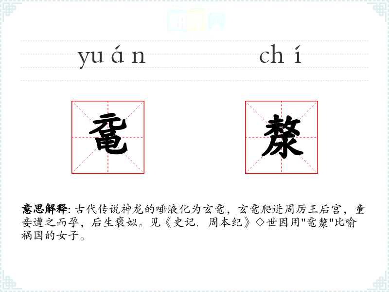古代传说神龙的唾液化为玄鼋,玄鼋爬进周厉王后宫,童妾遭之而孕,后生褒姒。见《史记.周本纪》◇世因用"鼋漦"比喻祸国的女子。