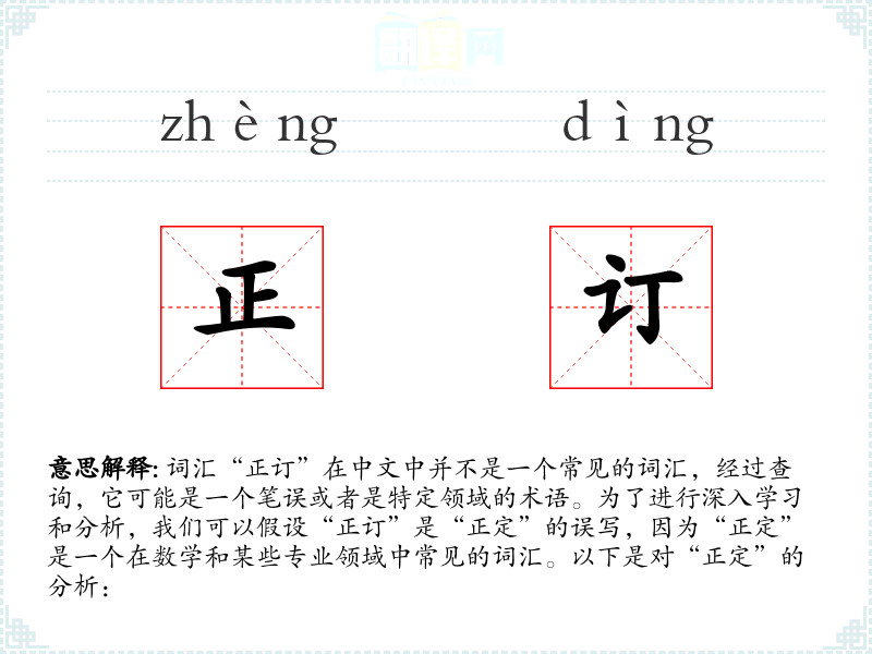 词汇“正订”在中文中并不是一个常见的词汇,经过查询,它可能是一个笔误或者是特定领域的术语。为了进行深入学习和分析,我们可以假设“正订”是“正定”的误写,因为“正定”是一个在数学和某些专业领域中常见的词汇。以下是对“正定”的分析: