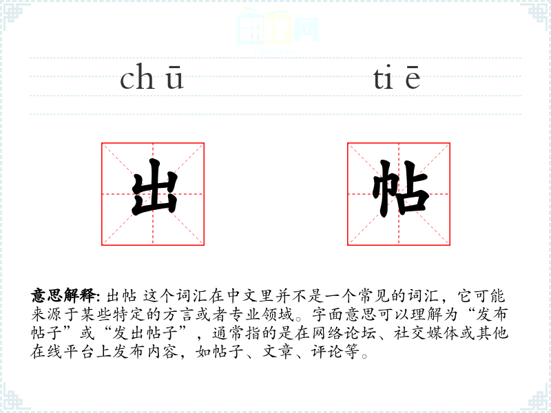 在网络交流中,“出帖”可能指的是用户在论坛或社交媒体上发布新的讨论主题或回复。在某些特定的社区或论坛中,这个词汇可能更为常见。