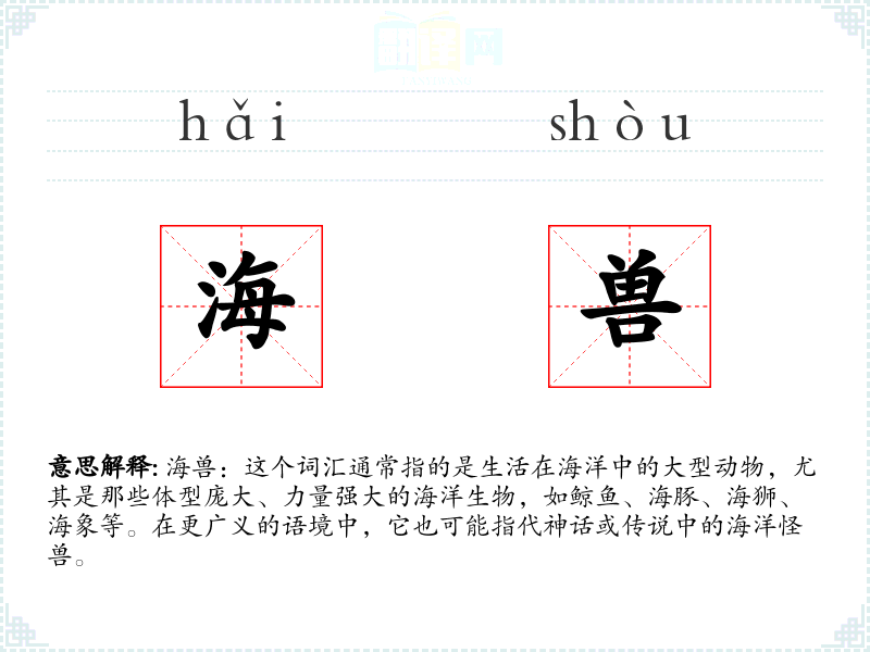 海兽:这个词汇通常指的是生活在海洋中的大型动物,尤其是那些体型庞大、力量强大的海洋生物,如鲸鱼、海豚、海狮、海象等。在更广义的语境中,它也可能指代神话或传说中的海洋怪兽。