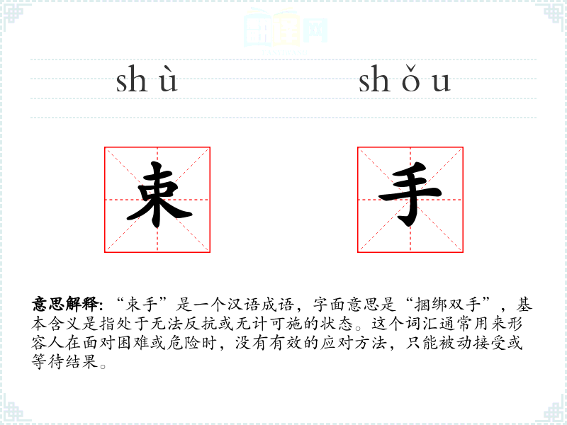 “束手”是一个汉语成语,字面意思是“捆绑双手”,基本含义是指处于无法反抗或无计可施的状态。这个词汇通常用来形容人在面对困难或危险时,没有有效的应对方法,只能被动接受或等待结果。