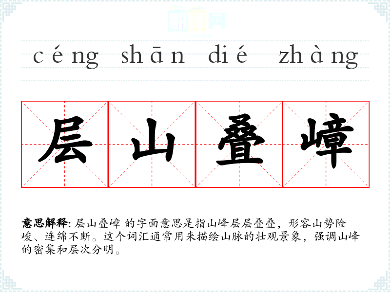 层山叠嶂 的字面意思是指山峰层层叠叠,形容山势险峻、连绵不断。这个词汇通常用来描绘山脉的壮观景象,强调山峰的密集和层次分明。