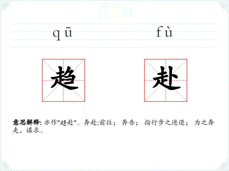 亦作"趍赴"。奔赴;前往; 奔告; 指行步之进退; 为之奔走,谋求。