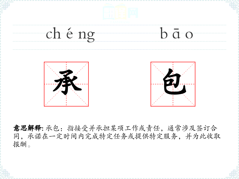 承包:指接受并承担某项工作或责任,通常涉及签订合同,承诺在一定时间内完成特定任务或提供特定服务,并为此收取报酬。
