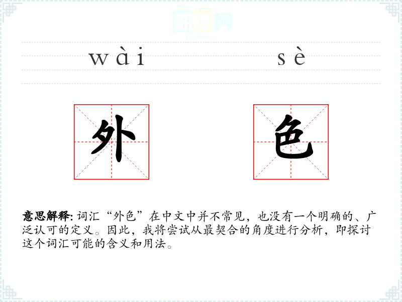 由于“外色”不是一个常用词汇,它的词源和历史演变不明确。它可能是由“外”和“色”两个字组合而成,分别表示“外在的”和“颜色”。
