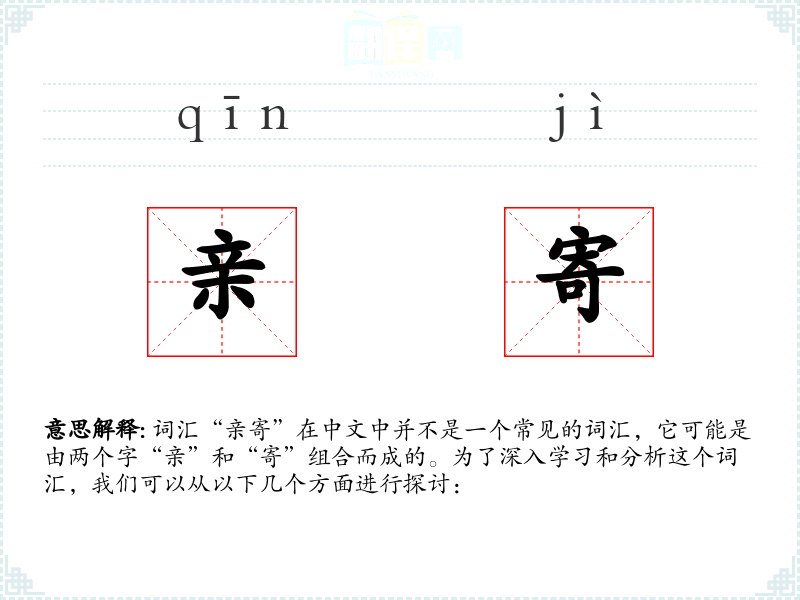 - 词源:亲寄可能是由“亲”和“寄”两个常用汉字组合而成的新词,没有特定的历史词源。