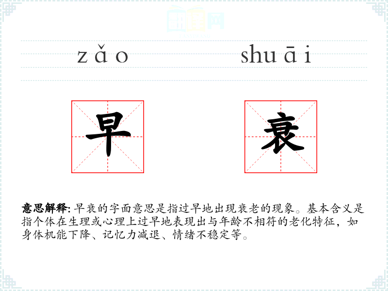 早衰一词由“早”和“衰”两个字组成。“早”表示时间上的提前,“衰”表示衰退或老化。在古代汉语中,“衰”常用来形容事物的衰退或人的老化。随着医学和心理学的发展,早衰一词逐渐被用来指代特定的生理或心理现象。
